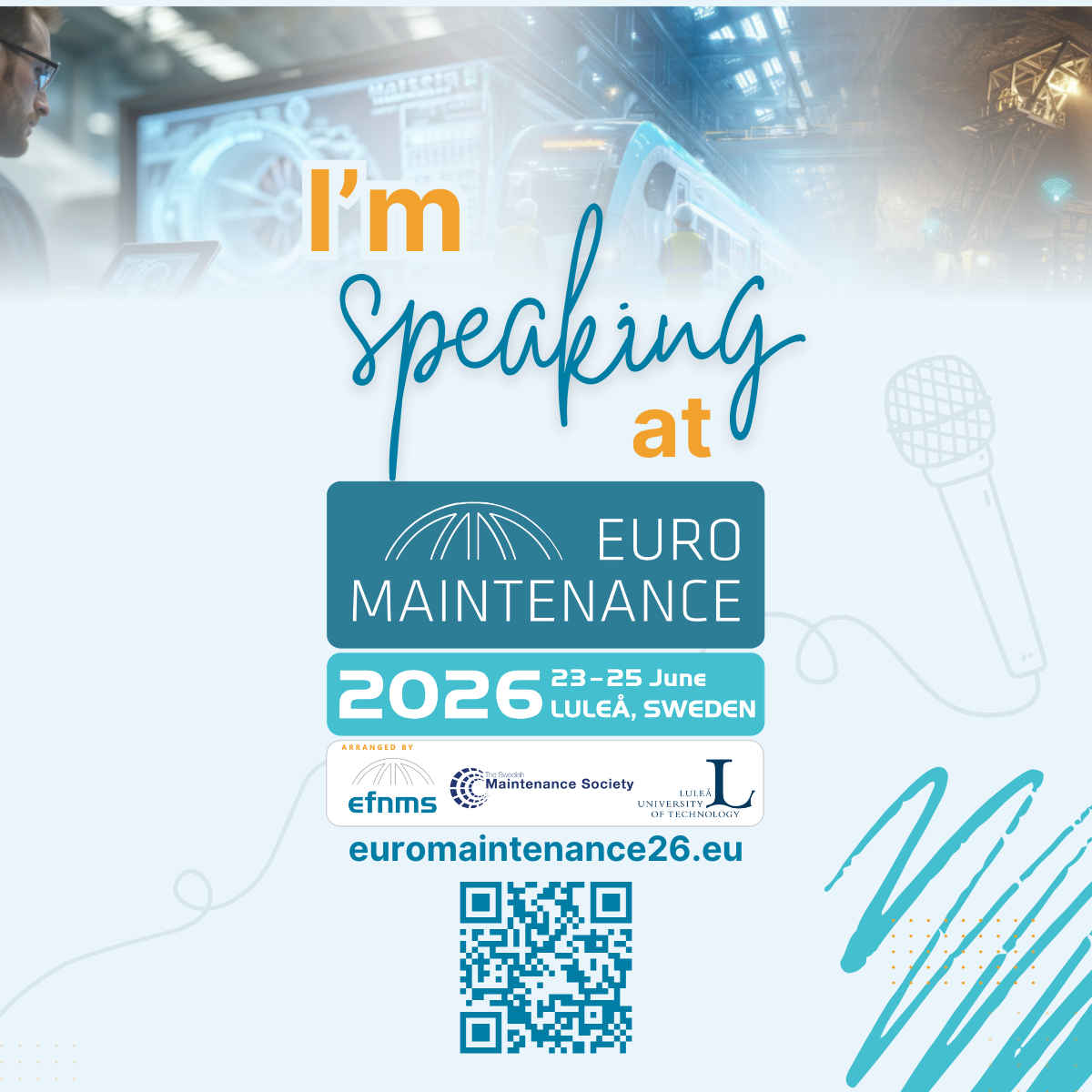 The European Federation of National Maintenance Societies (EFNMS), together with Luleå University of Technology in collaboration with the Swedish Maintenance Society, invite experts from industry, academia, and professional associations to contribute to EuroMaintenance 2026 by organising dedicated sessions and submitting papers.